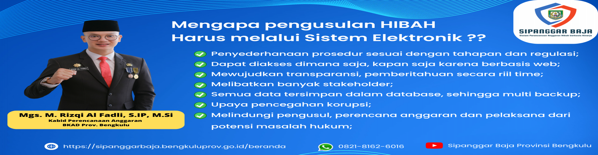 Sistem Perencanaan Anggaran Hibah berbasis kinerja atau Sipanggar Baja Provinsi Bengkulu merupakan inovasi Pemerintah Provinsi Bengkulu dalam rangka menciptakan transparansi, akuntabilitas dan integrasi pelayanan dalam pengelolaan hibah yang bersumber dari Anggaran Pendapatan dan Belanja Daerah Provinsi Bengkulu dan berbasis kinerja